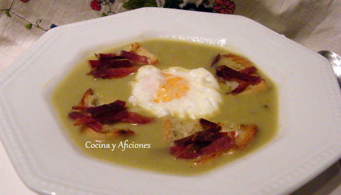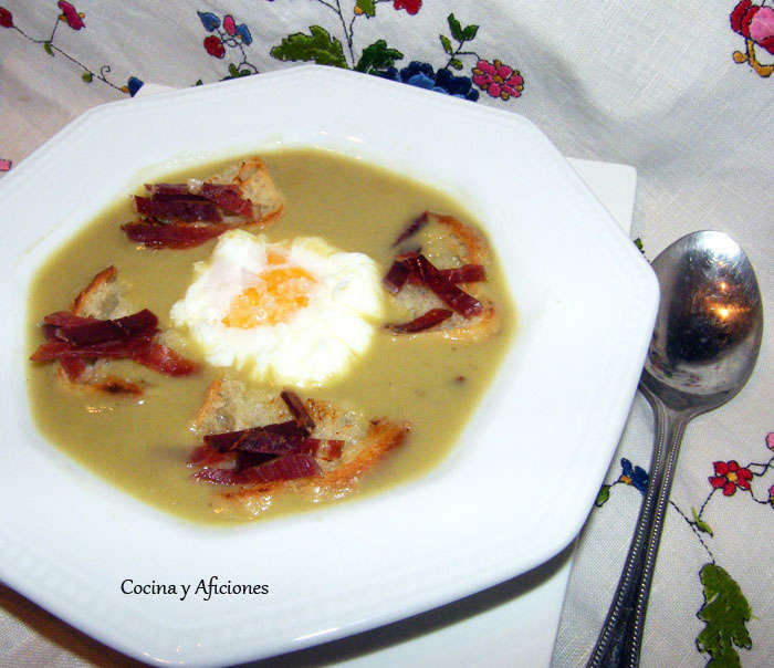 Colocamos una generosa cantidad de crema de judías verdes en un plato hondo, en el centro ponemos el huevo poche, los costrones de pan rodeando y las virutas de jamón por encima, en crudo que se calienten con el calor del plato.