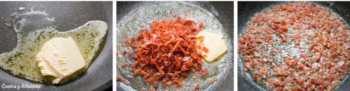 Picamos el jamón en la picadora, que nos quede muy pequeño para que se integre en la bechamel. En una sartén con mantequilla lo doramos, en plan rápido un par de vueltas y que tome un poco de color.