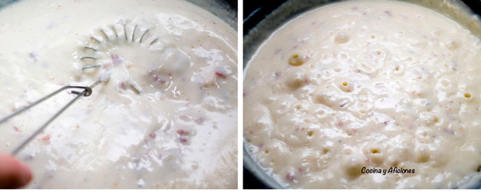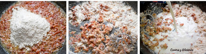 Le incorporamos la harina, la doramos un poco y empieza la fiesta añadimos leche, movemos para disolver la harina, tendremos que añadir la leche necesaria hasta que no nos queden grumos.