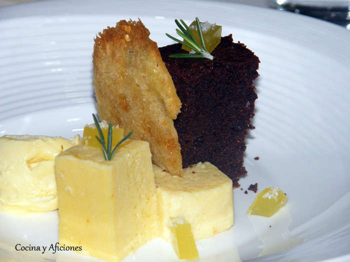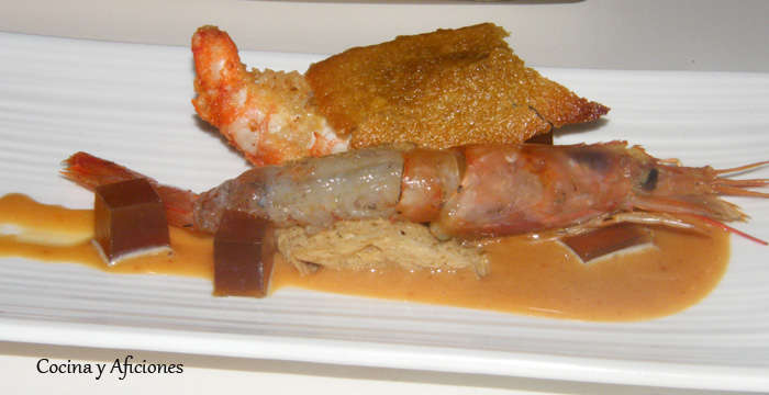 Gambón ahumado y marinado, roca esponjosa de hongos y lecho de turrón
