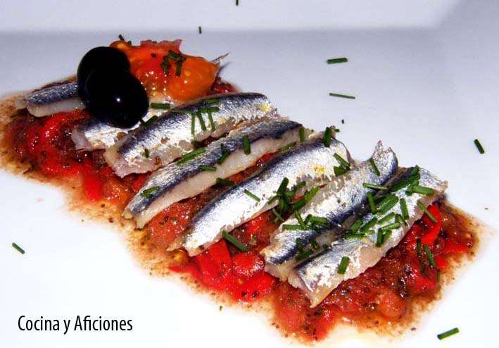 Ensalada de anchoas con pimientos del piquillo: Cuando le das el primer bocado a esta ensalada, te quedas asombrado, es una mezcla de sabores perfecta, hay un equilibrio increíble entre todos los ingredientes, ninguno destaca sobre los demás, todos forman un conjunto armónico que hace que comer esta ensaladita sea un placer. Para rematar la faena le ponemos unas aceitunas negras “perlas del Guadalquivir” por encima.