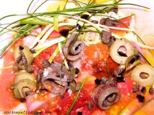 Ensalada de “tomates”, anchoas y aceitunas: El acierto de esta ensalada es que nos vamos a tomar los tomates en diferentes texturas, como base un gazpacho, tomates cherrys asados, flor de tomate (los corazones) bellos y sabrosos y para completar le vamos a añadir cebolletas moradas encurtidas que aportan un toque genial de vinagre, anchoas y una mezcla de distintas variedades de aceitunas: perlas del Guadalquivir, empeltre aragonés y aceitunas de Camporreal. Un plato lleno de color y de sabor. Una ensalada diferente.