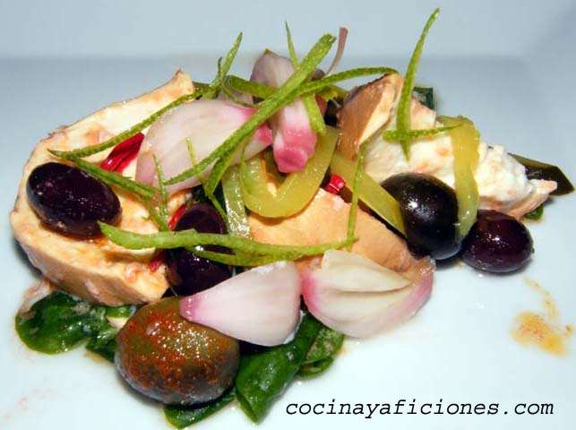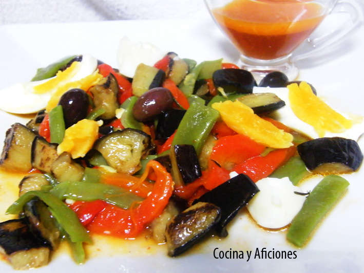 Ensalada de vegetales “DIABLA”: Esta ensalada es fruto de la casualidad ya que empecé la casa por el tejado. En mi archivo de recetas busque una vinagreta apetecible, me encanto la “Vinagreta Picante” de Arzak, ya no tenía más que buscar los ingredientes adecuados ante tan contundente aliño: berenjena resulto perfecta ya que se adueña de todos los sabores que la rodean, el pimiento aporta dulzor, las judías el toque crujiente, las aceitunas color y sabor. Resultado: una ensalada perfecta.