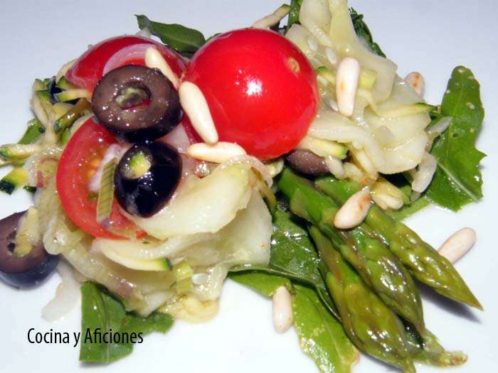 Ensalada marinada con espárragos verdes: Esta ensalada es genial, siempre digo lo mismo de mis ensaladas, pero modestia aparte es verdad. Es una ensalada muy fresca y al añadirle soja, jengibre y limoncillo le da un toque oriental muy gracioso. Para darle el toque picante le ponemos piparras, las guindillas vascas verdes en conserva, que me gustan mucho para las ensaladas, le aportan el punto picante y de vinagre, y para terminar unas aceitunas negras. Un conjunto perfecto.