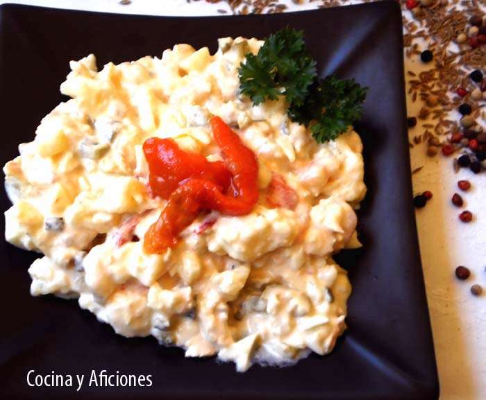 Ensaladilla rusa: La ensaladilla rusa es un plato que tiene mucha tradición dentro de las familias. Cada ensaladilla tiene su propia personalidad, muchas llevan zanahoria o cebolla, otras como la mía, pepinillos en vinagre y aceitunas rellenas de anchoas. El nexo de unión de todas ellas es la patata y la mahonesa que son ingredientes que nunca faltan. Puedo garantizar que mi ensaladilla sale perfecta y riquísima, es una formula requeteprobada, la he preparado cientos de veces y tiene sus fans incondicionales.