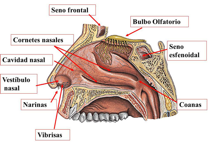 Detrás de las narinas nos encontramos con el vestíbulo nasal un espacio recubierto de piel con glándulas sebáceas y sudoríparas y gran cantidad de folículos pilosos llamados vibrisas y que actúan como filtro reteniendo impidiendo que pasa al interior de nuestro cuerpo polvos motas de aire contaminadas partículas gruesas…