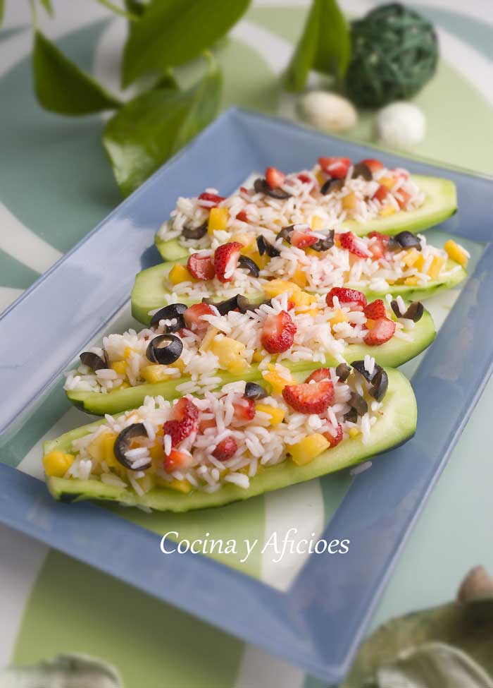 Rellenamos las barquillas de pepino con la ensalada de arroz, decoramos con fresas y servimos.
