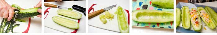 2.- Pelamos el pepino y lo vaciamos con un sacabocados, lo cubrimos con sal y lo dejamos escurrir quince minutos, pasado este tipo lavamos con abundante y los metemos en agua con hielo, super fria para que se pongan crujientes, en el momento de utilizarlos los secamos con papel cocina.
