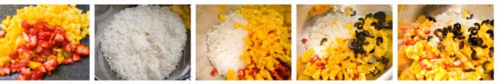 4.-Añadimos el arroz y las aceitunas picadas al bol de la fruta, aliñamos con el resto del aceite y los vinagres, probamos y ajustamos el punto de sal.