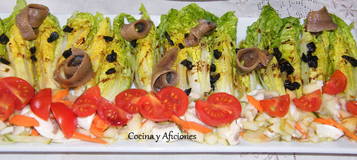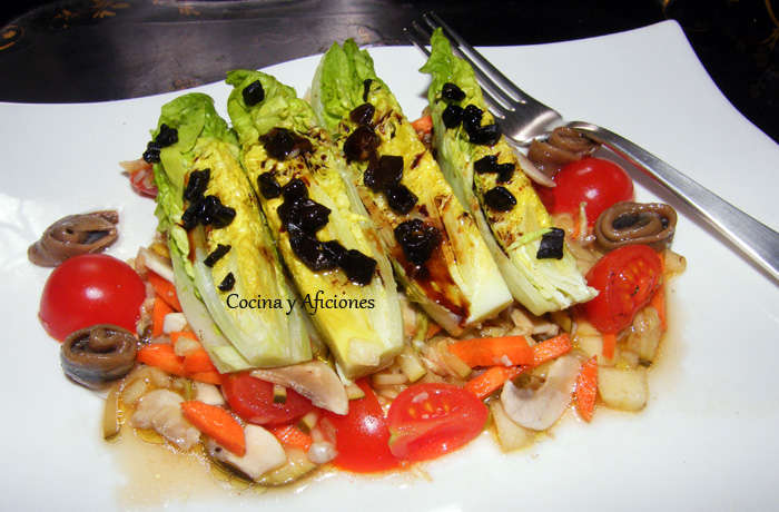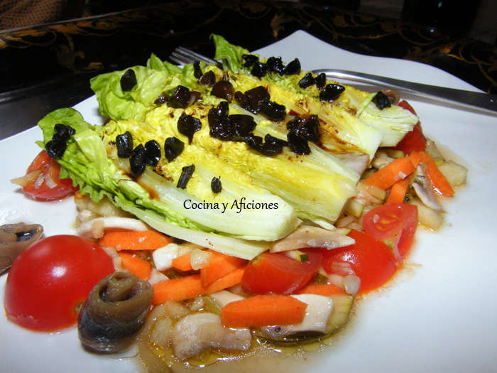 Vamos a montar esta ensalada en una fuente alargada. Extendemos por toda la fuente una cama de vinagreta de verduras, encima colocamos los cuartos de cogollos en fila, uno al lado del otro, a sus pies colocamos una fila de trocitos de tomate cherry y encima de los cogollos las anchoas enrolladas y la picada de ajo negro, regamos con el aliño y con un chorrito de reducción de Pedro Ximenez