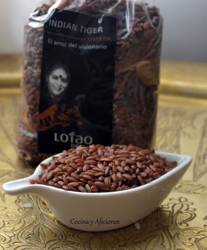 Voy a utilizar un arroz rojo llamado “Indian Tiger Umbra”, el arroz de la visionaria, lo envasa Lotao y es originario de la India, tiene un bajo rendimiento por hectárea y se cultiva en difíciles condiciones geográficas. Es un arroz basmati integral rojo que debe su color al suelo arcilloso donde se cultiva. Rico en fibra, proteínas y ácidos grasos insaturados, es perfecto para ensaladas o acompañar carnes a la parrilla.