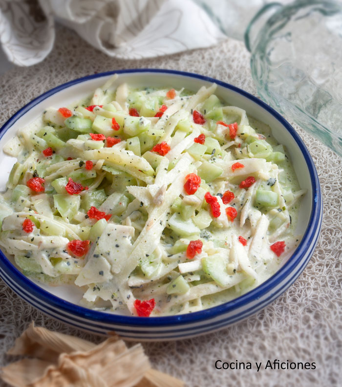 – Si quieres suavizar el pepino lo puedes colocar en un colador y añadirle sal dejarlo escurrir 10 minutos y después meterlo en agua con hielo durante 10 minutos. Deberás secarlo muy bien con papel cocina para que no te caiga agua la ensalada.