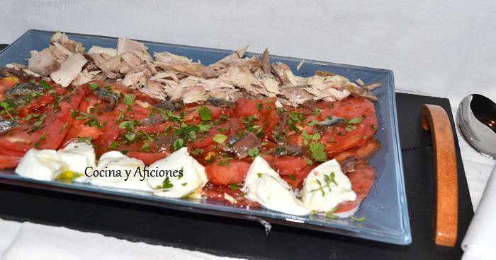 2 hermosos tomates, maduros pero tersos, 200 gr. de bonito (fresco o de lata), 1 mozarella de búfala, 1 c/c de tomillo y de perejil fresco.