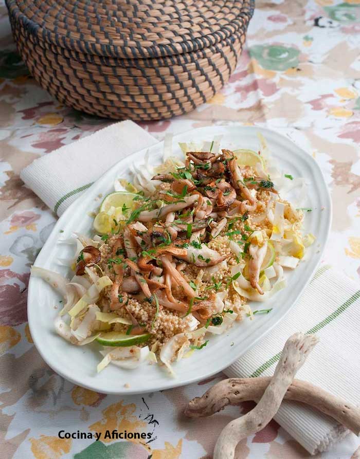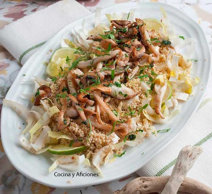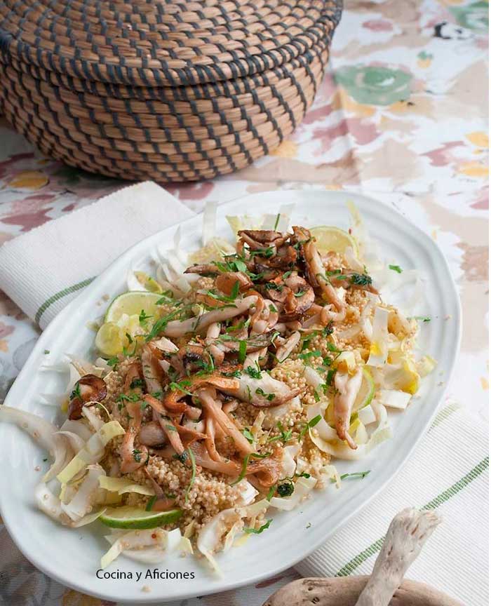 - Montamos el plato poniendo una base de quinua alrededor la endivia cortada en tiras finas y por encima las setas, intercalamos rodajas de lima, regamos con el aliño y servimos