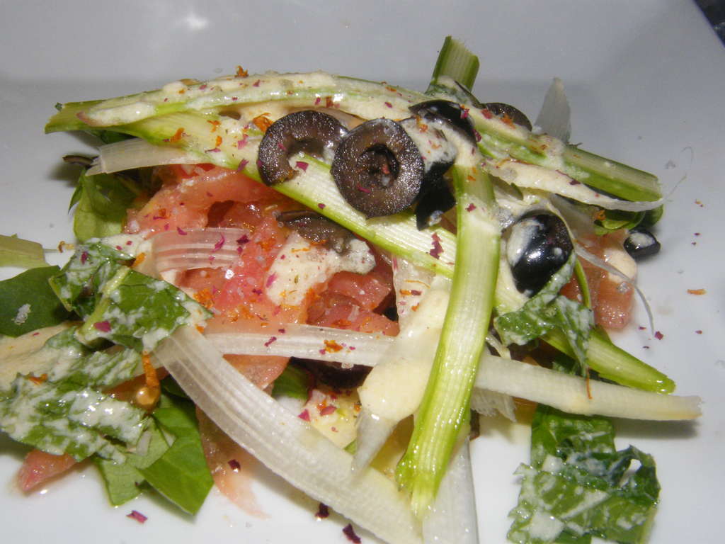 4 espárragos blancos, 4 espárragos verdes, brotes tiernos, 1 tomate grande, aceitunas negras, menta fresca.
