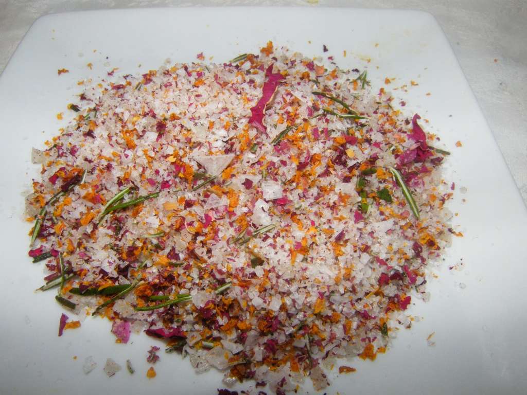 Colocamos una cama de brotes y los tomates, atravesamos los tallarines de espárragos, las aceitunas y la menta, napamos con la vinagreta y la espolvoreamos con sal de rosas.