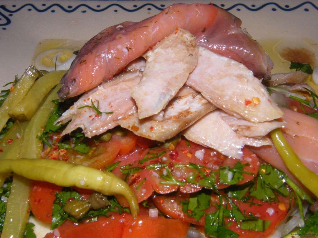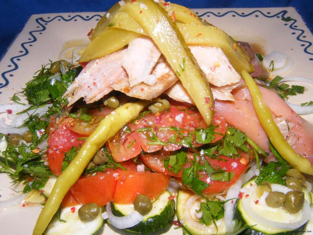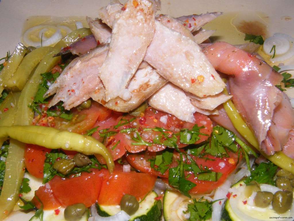 Disponemos en un  plato bonito una cama de rodajas del marinado de  calabacín y de cebolla, guardamos el aliño. Encima colocamos el tomate, el salmón lo enrollamos formando rulos y los colocamos encima de los vegetales. Hacemos lo mismo con la ventresca y con el resto de los ingredientes.