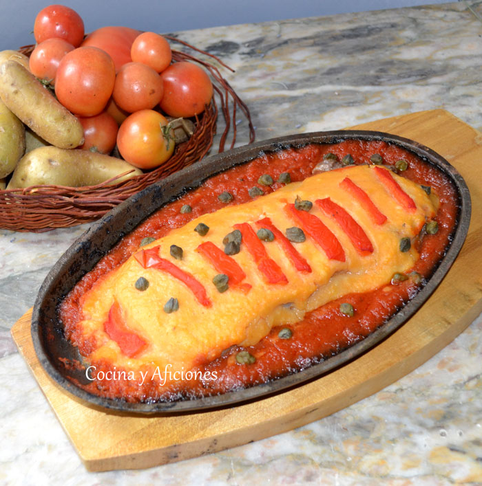 Colocamos una cantidad generosa de la mezcla anterior sobre el flete, Decoramos con tiras de pimientos alcaparras.