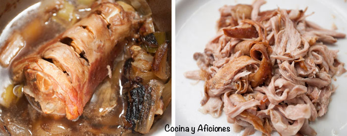 - Dejamos enfriar separamos la carne y la desmigamos poniéndola en un bol.