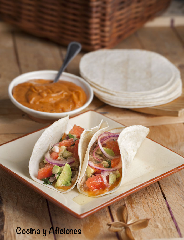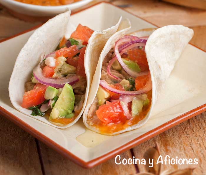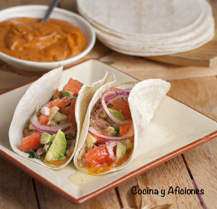 Calentamos las tortillas y la carne, en cada tortilla ponemos una generosa ración de carne, añadimos el pico de gallo y salseamos. Servir inmediatamente.