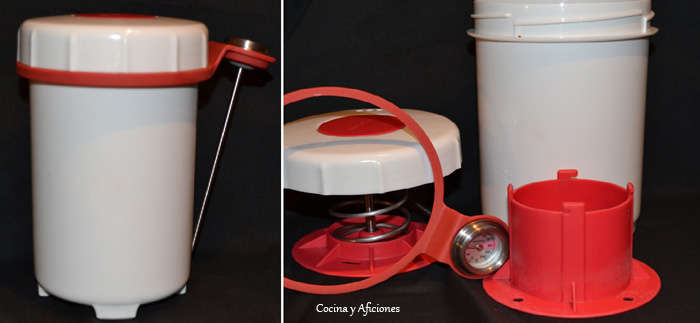 Para hacerlo me he agenciado un aparatito que mola muchísimo, es un molde de plástico y silicona con un muelle de acero y un termómetro, se llama Presto (tienes un video demostración), lo encontré en una web de esas en las que me vuelvo loca visitando, llena de cositas increíbles para mi cocina: TESCOMA, utensilios de cocina. Ya sé que estarás pensado otro cacharro mas que no me cabe, lo voy a usar poco y todas esas cosas que ya nos sabemos pero te aseguro que los fiambres salen riquísimos y lo puedes dar más utilidades, es un compartimento estanco perfecto para los baños María y la cocción a baja temperatura que a mí me encanta.