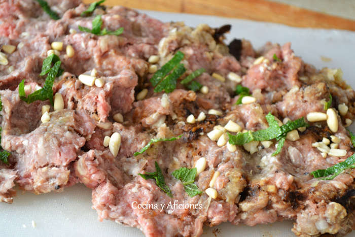 – Extendemos la carne encima de la tabla de cortar, salamos y pimentamos, añadimos la nuez moscada, el ajo negro, la menta picada y los piñones. Amasamos bien para que se mezclen los ingredientes. Colocamos en un bol.