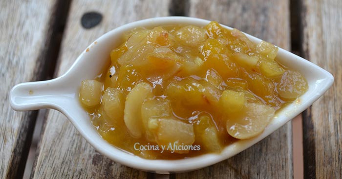 Cortamos toscamente la fruta y la ponemos en una cazuela, añadimos el azúcar, el jengibre y la sal y dejamos cocer durante 20 minutos a fuego lento.