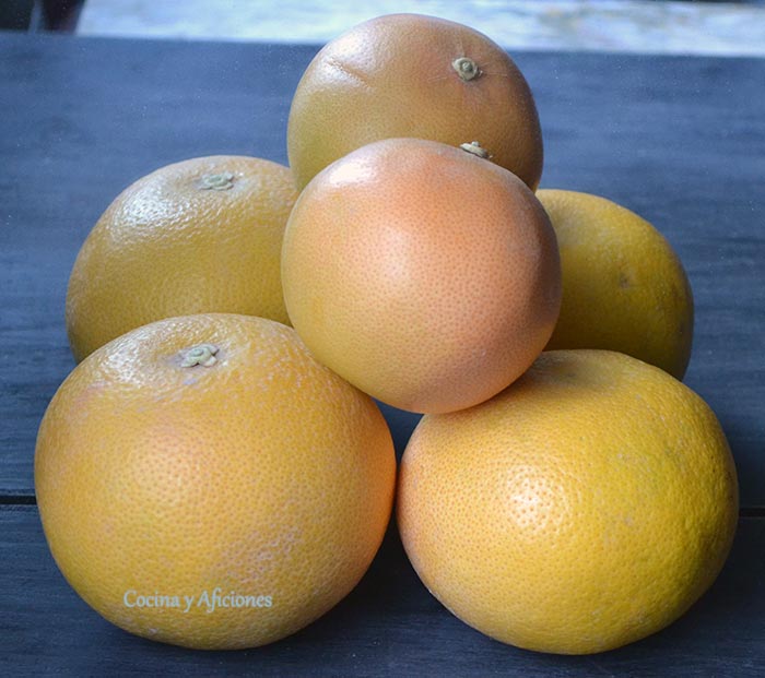 Para preparar esta delicia gastronómica he contado con una materia prima de primerísima calidad: mis pomelos, recién recolectados, sin ceras ni cosas raras, frescos y llenos de zumo, una maravilla que huele genial.