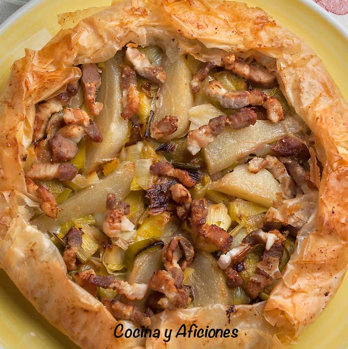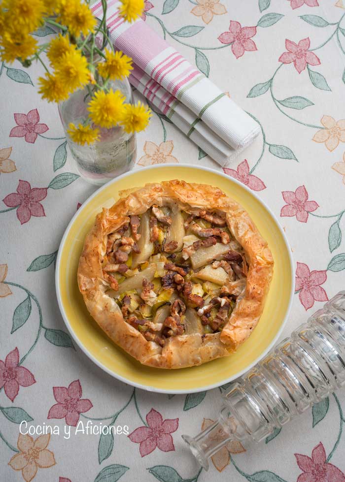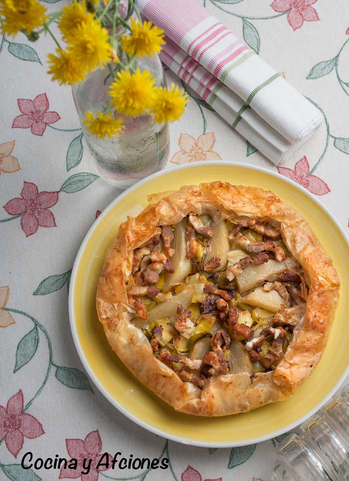 Galette o tarta salada de puerros, peras y panceta fresca, receta molona
