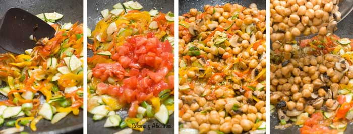 6.- Juntamos las verduras del wok, los garbanzos y los champiñones, removemos y mezclamos, dejamos cocinar unos minutos para mezclar sabores