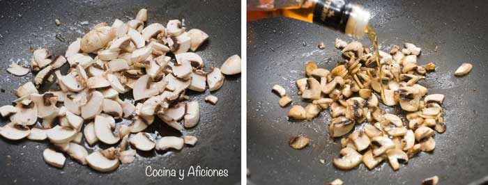 4.-Cuando el aceite esté caliente añadimos los champiñones y los rehogamos a fuego muy vivo hasta que cambien de color, los flambeamos con mucho cuidado y con la campana extractora apagada.