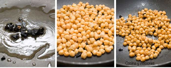 3.- Llevamos el wok al fuego, le añadimos 4 c/s de aove, dejamos que se caliente y le incorporamos la mitad de los ajos negros , sofreímos para que el aceite se aromatice. Añadimos los garbanzos, los doramos y los retiramos.