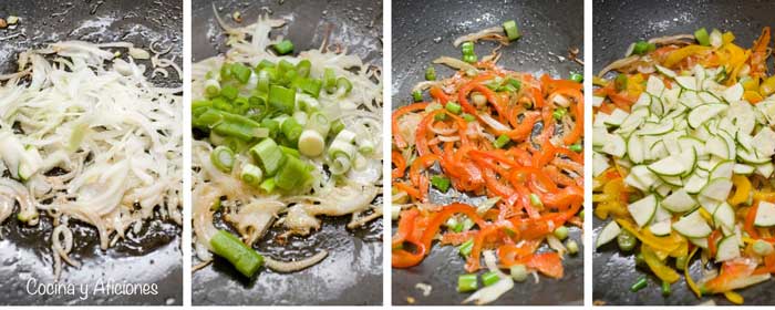 5.- Volvemos a añadir aceite y el resto de los ajos, doramos e incorporamos las verduras de más dura a más blanda, empezamos con la que más tarde en cocinarse , dejamos dos o tres minutos entre verdura y verdura. Cocinamos a fuego vivo no queremos que suelten agua, terminamos con el tomate.