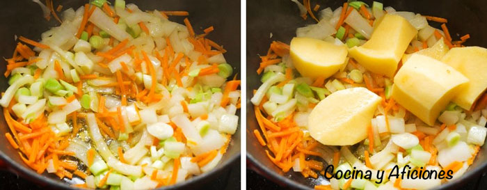- Ponemos en la olla un poco de aceite y sofreímos las verduras, empezaremos con la zanahoria y la cebolla, las dejamos hasta que comiencen a cambiar de color.