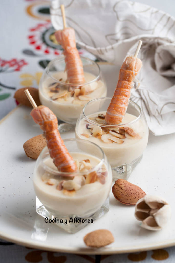 Esta vez la he acompañado con gambas, pero te dejo otra versión de mi rico gazpachuelo acompañado de una cigala y almendras tostadas al pie de la receta