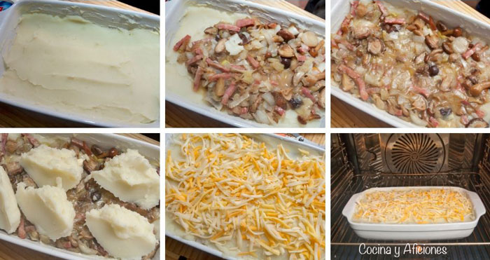 6.- Reparte las setas encima de las patatas, una capa que las cubras
