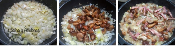 3.- Pela, pica la cebolla y fríe en aceite vegetal hasta que este trasparente. Lava bien las setas, añádelas a la cebolla y cocínalas, incorpora los lardones de bacon y deja que se doren.