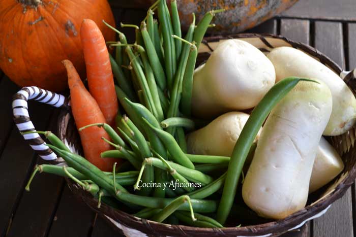 Verduras: 200 g de judías verdes, 1 nabo, 2 zanahorias, 1 rama de apio, ½ calabacín.