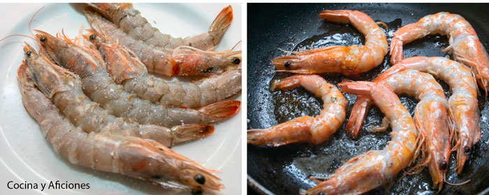 • ponemos los langostinos en una fuente, los salamos  y los pimentamos, los dejamos reposar unos minutos.
