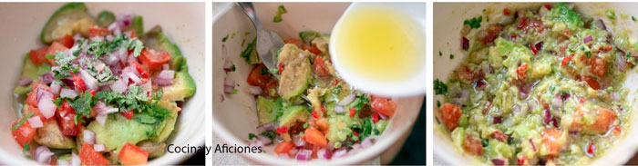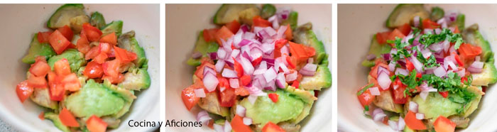 • Quitar la piel, cortar en cubos súper pequeños la carne del aguacate, regar con zumo de limón para que no se oxide.
