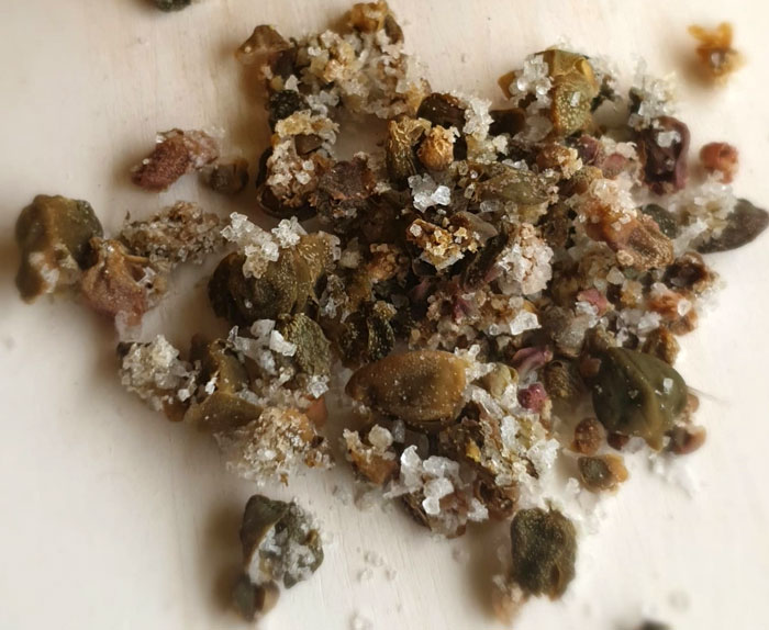 Si utilizas alcaparras italianas saladas tendrás que lavarlas y ponerlas a remojo para que se hidraten ya que vienen en salazón. Las mías son auténticas, compradas en el Mercato de Baraló, tienen todos los aromas de la isla