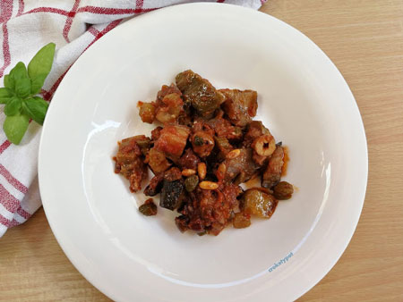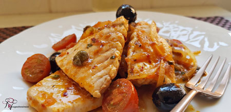 Me gusta este bacalao cocinado con tomate, alcaparras saladas, piñones y pasas, un contraste absoluto ya que en Sicilia las alcaparras se salan y tienen un toque diferente, mucho mas intenso y con mar sabor. Te va a encantar este sencillo guiso.