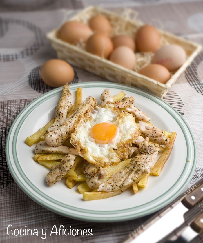 Como es un plato instantáneo que no admite demoras puedes ayudarte teniendo los ingredientes a medio cocinar, las patatas sofritas, justo para darles el punto dorado, el pollo listo a falta de calentarlo y el huevo preparado en un vaso con su pizca de sal.