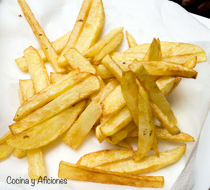 3.- Se pelan las patatas y se cortan en tiras gruesas, las salamos y las freímos primero en aceite no muy caliente para que se pochen, la sacamos y las dejamos escurrir. En el último momento, justo antes de comer, las meteremos en aceite muy, muy, caliente para que se pongan doradas y crujiente