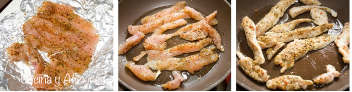2.- Cortamos las pechugas de pollo en tiras largas, las untamos con la pasta del adobo, y las envolvemos en papel de aluminio. Guardamos en la nevera mínimo una hora, a más tiempo más sabor.