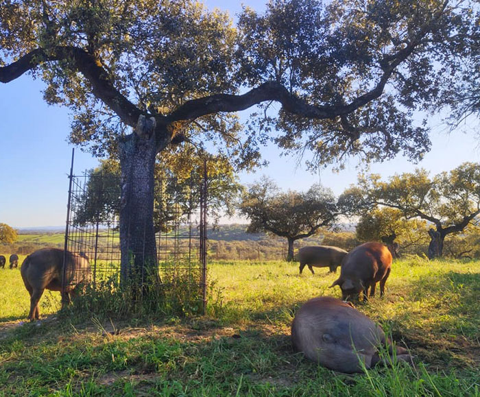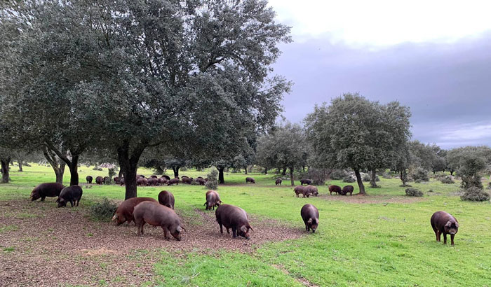 Estos ricos jamones provienen de cerdos de una única raza, viven en un ecosistema de encinas y alcornoques, denominado dehesa, tienen una gran amplitud de espacio ya que la carga ganadera es de un cerdo por hectárea.