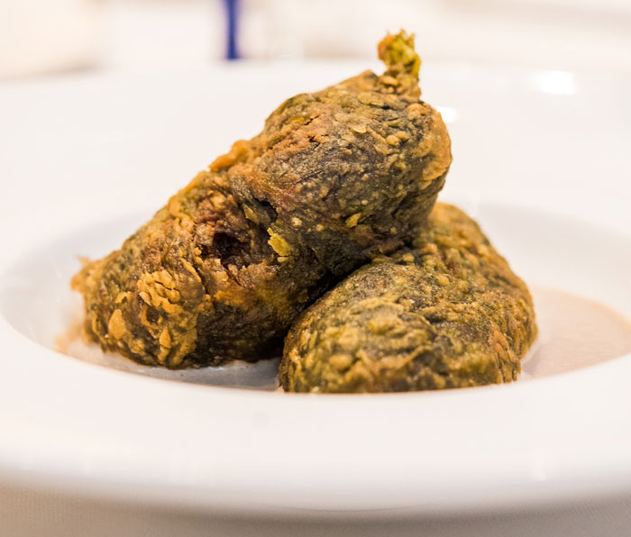 Después disfrutamos con unas delicias de acelga rellena de pato y trufa, que va napada con una salsa Périgordine que se elabora con trufa y demi glasse deliciosa. Me pareció un plato interesante y muy agradable.