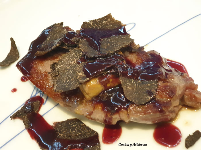 Continuamos nuestro ágape con un solomillo de ternera con trufa, foie y mora, por supuesto la carne de primera, una salsita de mora delicada y deliciosa, tacos de foie y por descontado una generosa cantidad de trufa en lascas finas que le ponen el broche de oro a este plato lleno de contrastes fabulosos.