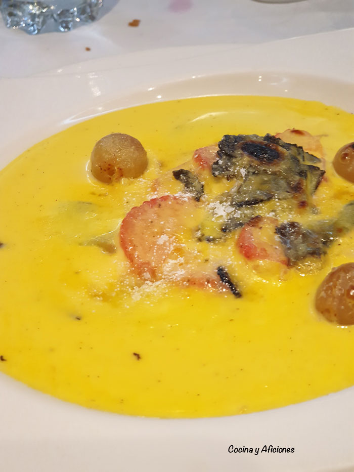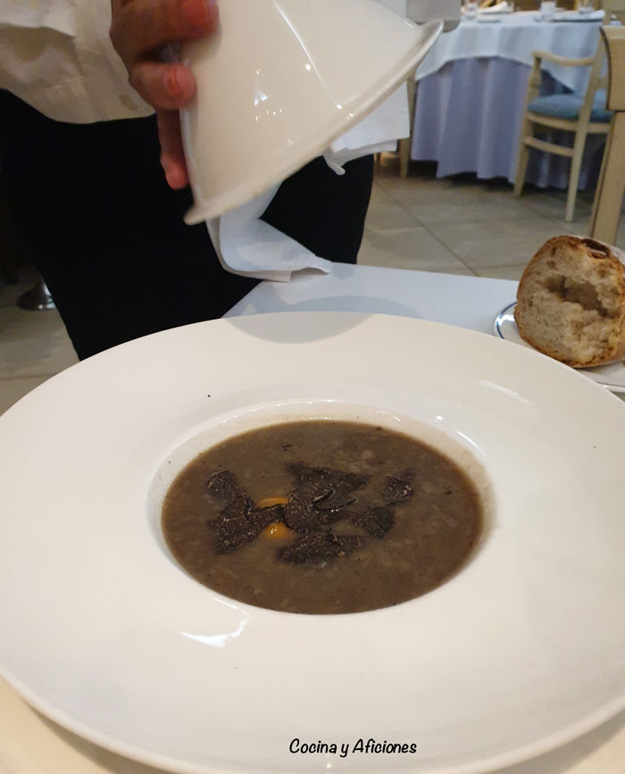 El siguiente vuelco fue una delicia de sopa de trufa negra reconfortante y agradable. Me dejó absolutamente encantada, va aderezada con yema de huevo y por supuesto trufa, cada cuchara te llenaba la boca y el espíritu de calor, sabor y aroma. Esta claro que no dejé ni una gota.