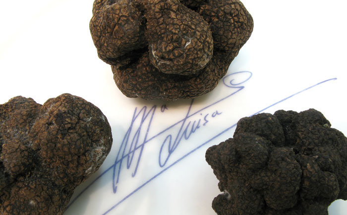 Trabaja las trufa, la Tuber melanosporum, en estado puro, nada de esencias, aceites o pastas raras que solo llevan saborizantes, aquí la trufa es trufa y punto. Las prepara de mil maneras y te las comes hasta en el postre que fue una sorpresa de lo más agradable.
